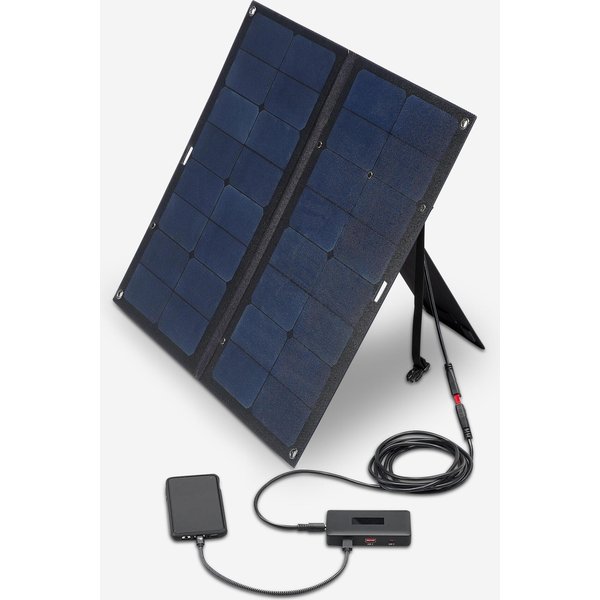 - OPERATING MODES: Connect the Anderson connector to the panel output (colour coded): red/black) and the other end of the cable on the black box to the "in" input. Then use the USB ports directly to charge your devices and/or the “out” output with the cable (5.5 mm connector) supplied with the solar panel. Several devices can be charged at the same time. A light indicator appears on the box to indicate that it is generating energy.