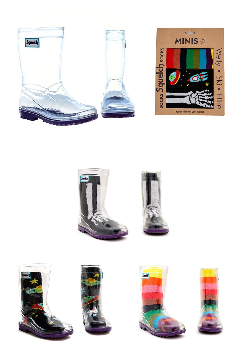 Transparent welly boots that come with three pairs of patterned welly socks in a gift box for your little one to choose from, creating a new welly boot look for themselves. Socks are size 3-6 years, one size fits all. Designs: X-ray, space, rainbow stripes.