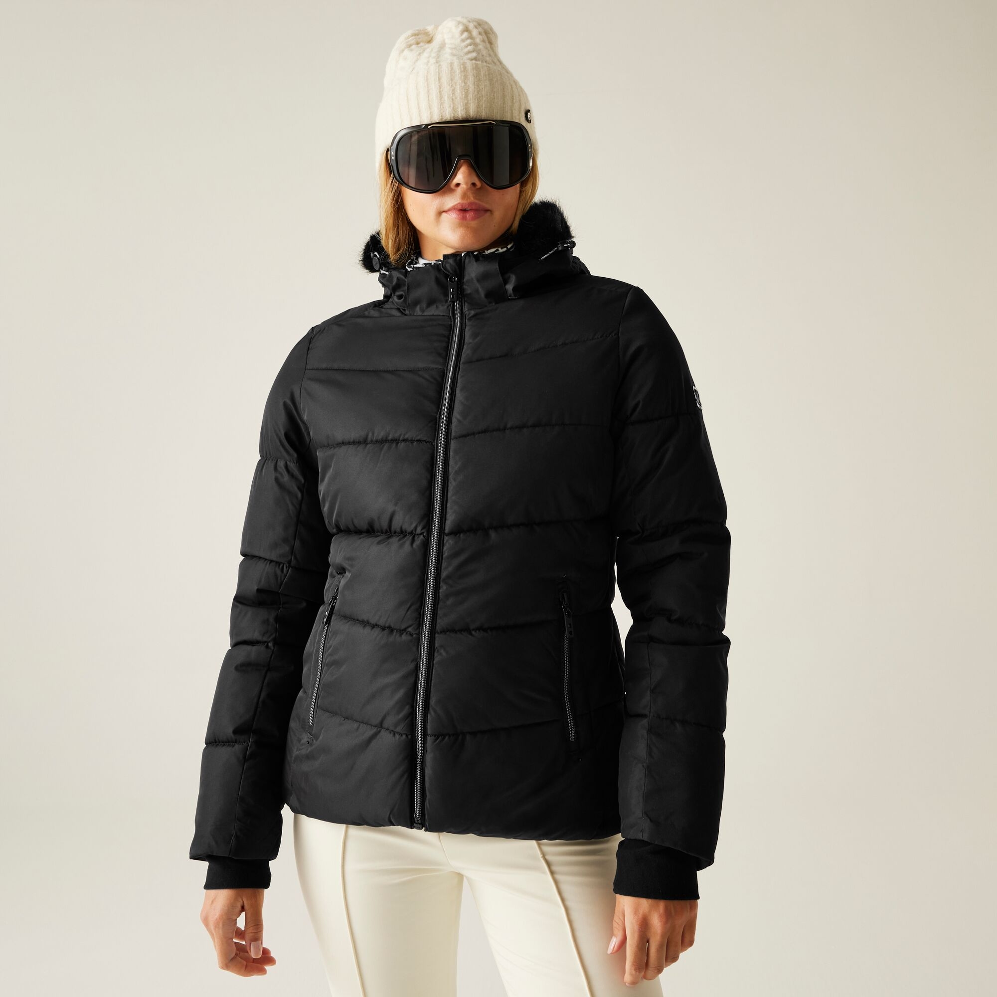 The Women's Glamorize V Jacket. Crafted from our advanced recycled waterproof and breathable Ared 10,000 fabric, this Dare 2b x Swarovski women's ski jacket gifts maximum protection from the elements. The water-repellent finish adds an extra layer of defence. The ladies ski jacket features recycled high-warmth padding, providing excellent insulation without the bulk. It comes with complete ski features, including a hidden ski pass pocket in the inner lining, a detachable snow skirt with a gel grip and an internal mesh pocket with a goggle lens wipe cloth, perfect for a day on the slopes. The detachable hood with an adjuster and removable faux fur trim offers versatility and style. For added protection and comfort, the jacket includes a chin guard and warm inner sleeve cuffs. The jacket's recycled stretch back panel with quilted design detail not only enhances comfort but also adds a stylish touch. To top it off, the badge and zip pullers are embellished with Swarovski crystals, giving this ski jacket a luxurious finish.